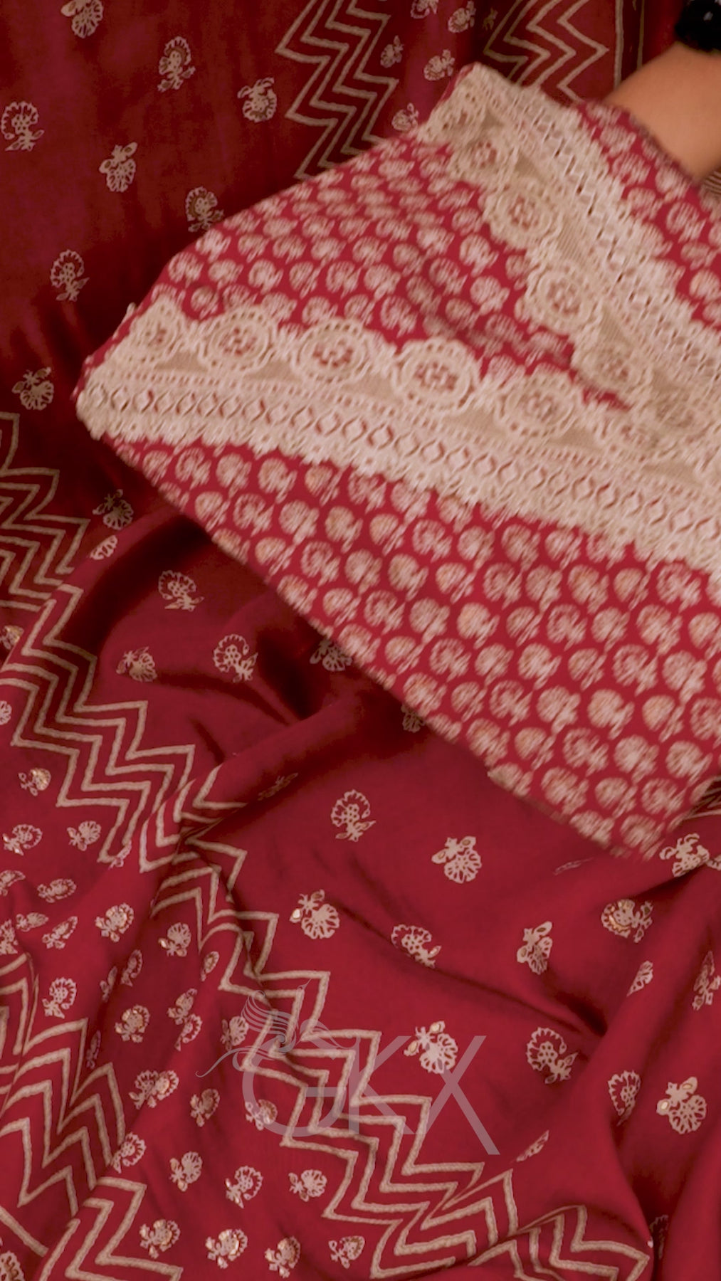 Beautiful unstitched maroon printed suit fabric with eye-catching floral motifs and detailed neckline work, perfect for custom tailoring into chic ethnic outfits for parties, festive occasions or everyday stylish wear.