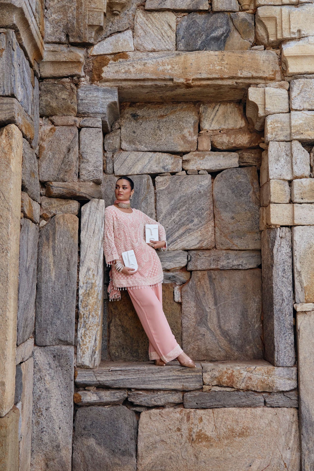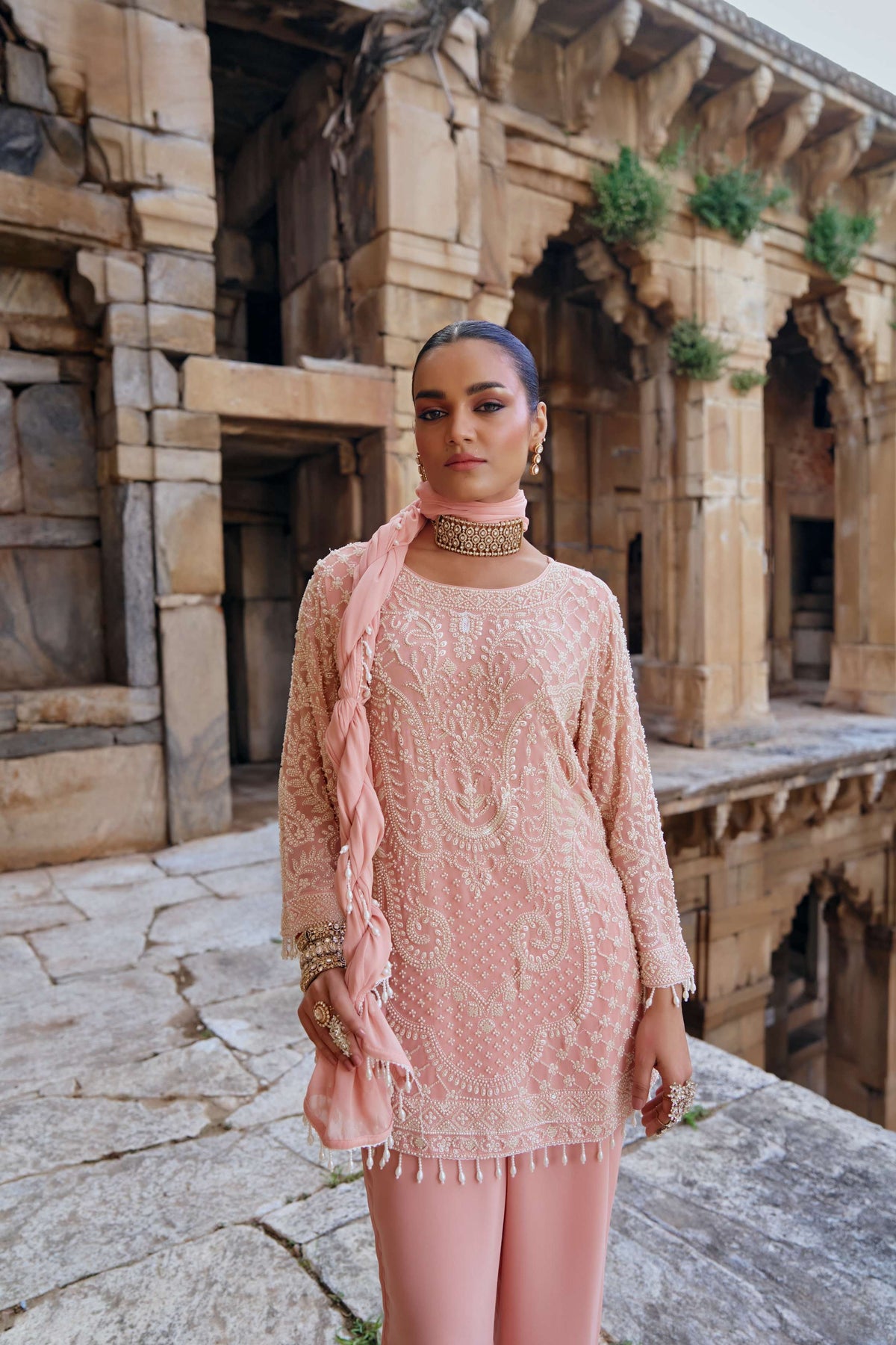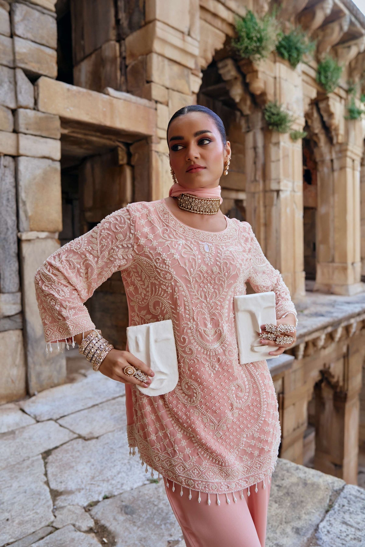 A blush peach ensemble adorned with intricate pearl and thread embroidery all over.The straight-cut kurta features delicate detailing and a beaded hem, paired with matching embellished trousers for a timeless, graceful look.