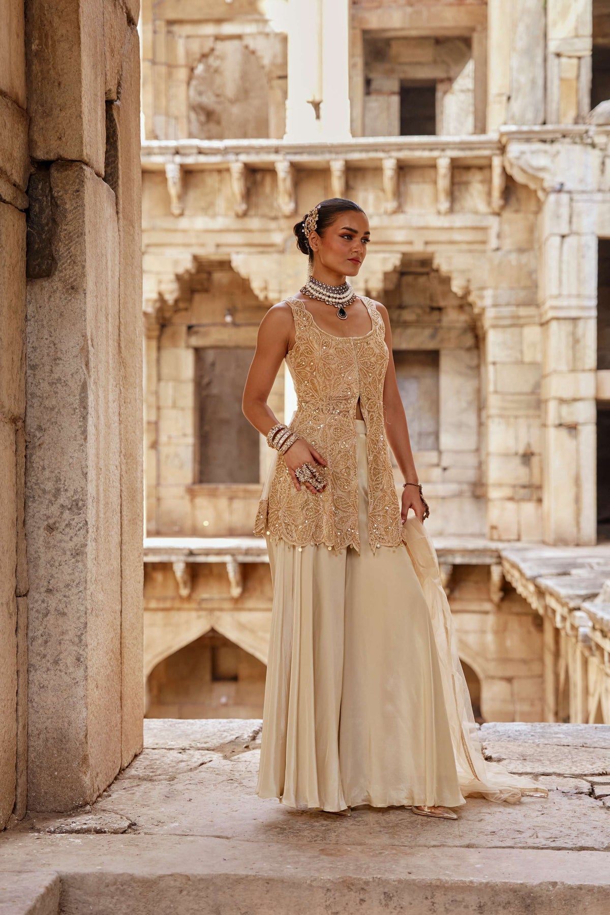 An elegant gold jacket set embellished with intricate sequins, cutdana, and mirror work.The structured jacket paired with a flared sharara and soft dupatta exudes understatedluxury—perfect for weddings and receptions.