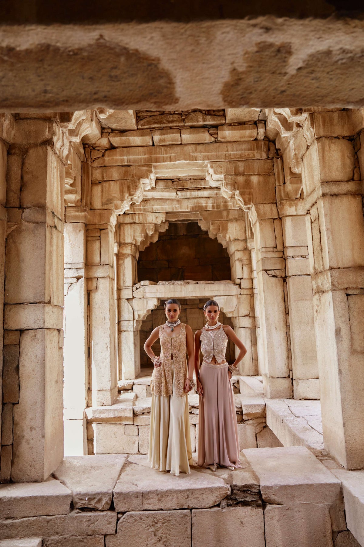 Colour : Champagne Gold Fabric : Crepe Dimensions : Chest - 38 inches Shirt Length - 30 Inches Pant Length - 43 Inches Model Details : 5' 7' Care Instructions : Dry Clean Only